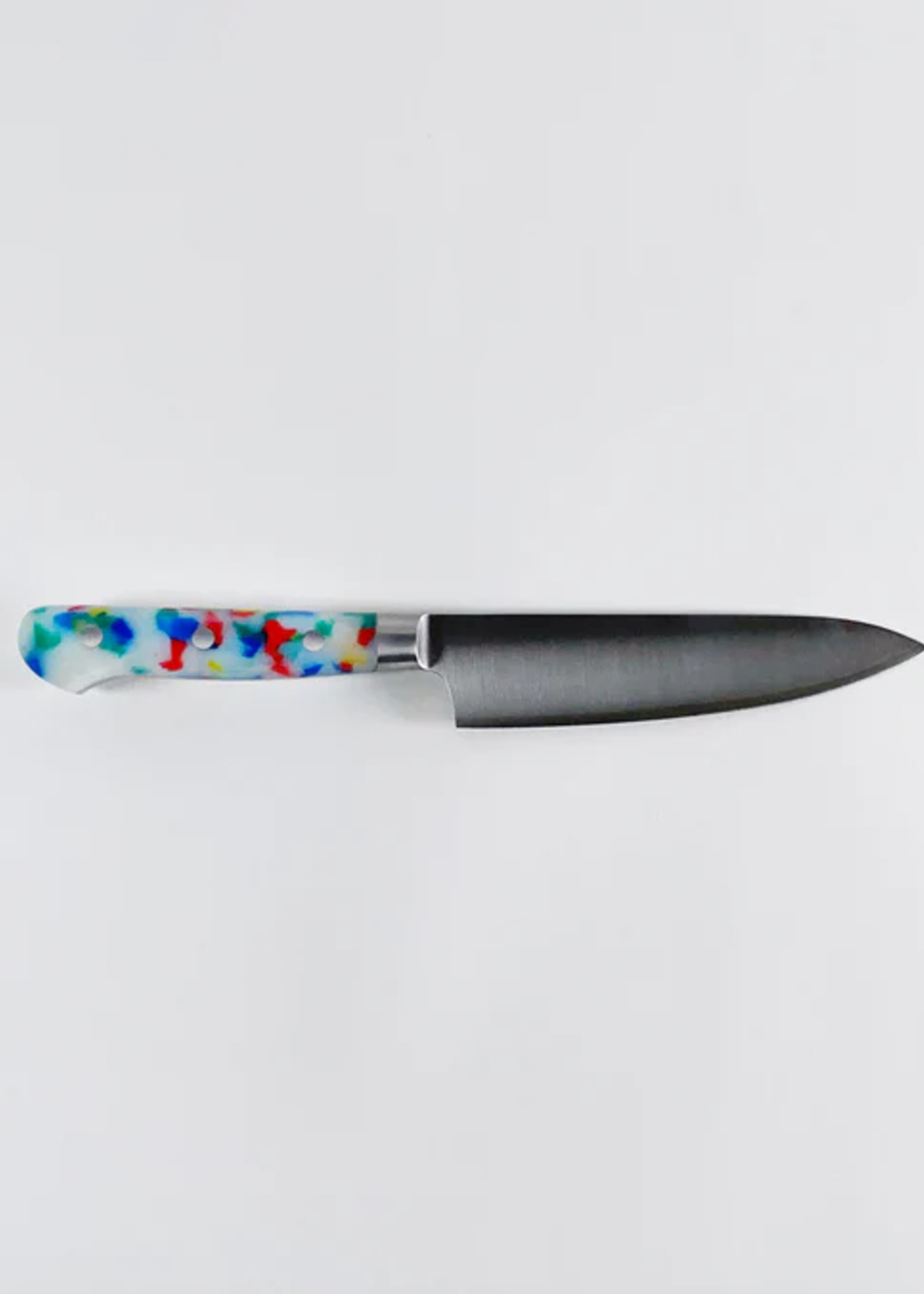This Utility knife is brings together a high quality steel blade and a festive, speckled handle made from the same material as our cutting boards. It's just a bit smaller than a chef's knife, for increase control.